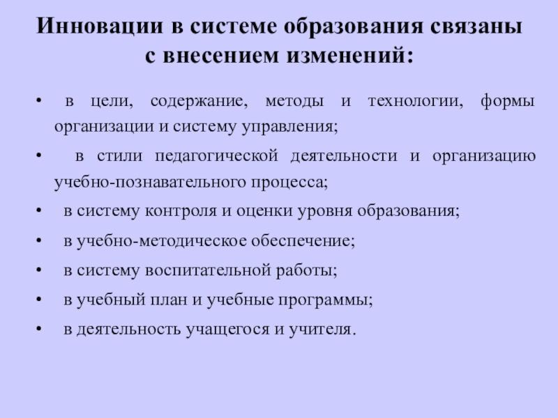 Слайд 5Инновации в системе образования связаны с внесением изменений: