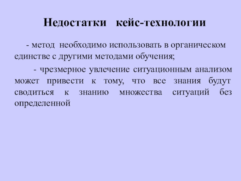- чрезмерное увлечение ситуационным анализом может привести к тому, что все знания будут сводиться к знанию множества ситуаций без определенной