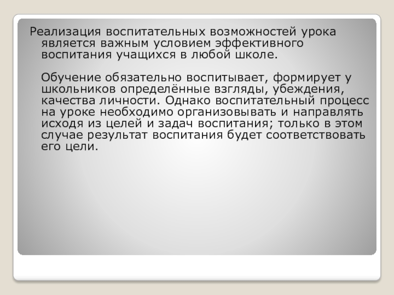 Слайд 8Реализация воспитательных возможностей урока является важным условием эффективного воспитания учащихся в