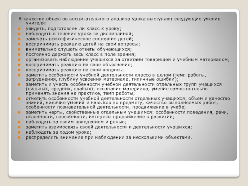 Слайд 15В качестве объектов воспитательного анализа урока выступают следующие умения учителя: