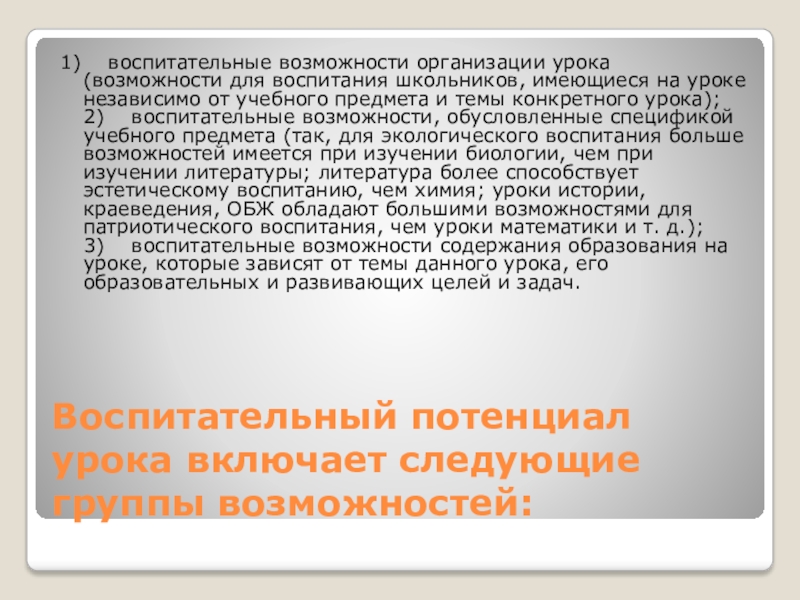 Слайд 9Воспитательный потенциал урока включает следующие группы возможностей: