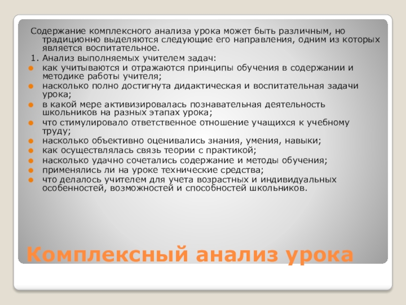 Содержание комплексного анализа урока может быть различным, но традиционно