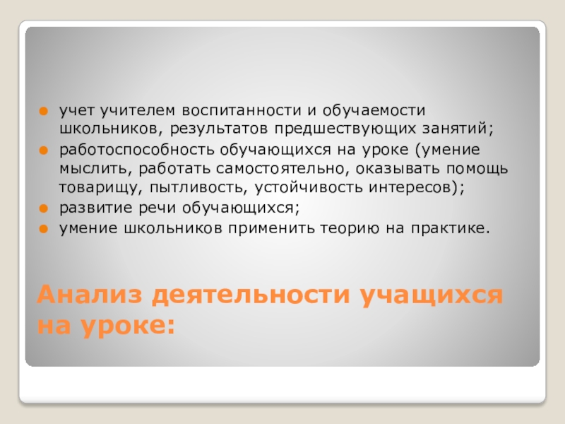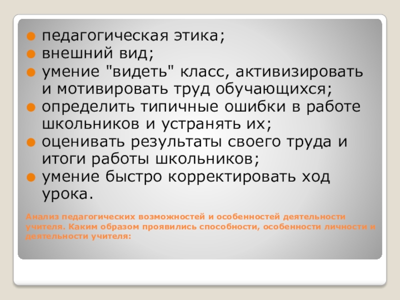 Слайд 13Анализ педагогических возможностей и особенностей деятельности учителя. Каким образом проявились способности,