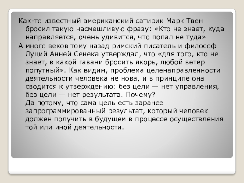 А много веков тому назад римский писатель и философ Луций Анней Сенека утверждал, что «для того, кто не знает, в какой гавани бросить якорь, любой ветер попутный». Как видим, проблема целенаправленности деятельности человека не нова, и в принципе она сводится к утверждению: без цели — нет управления, без цели — нет результата. Почему?