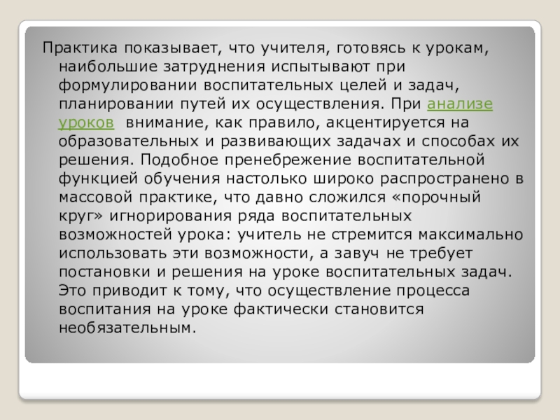 формулировании воспитательных целей и задач, планировании путей их осуществления. При анализе уроков внимание, как правило, акцентируется на образовательных и развивающих задачах и способах их решения. Подобное пренебрежение воспитательной функцией обучения настолько широко распространено в массовой практике, что давно сложился «порочный круг» игнорирования ряда воспитательных возможностей урока: учитель не стремится максимально использовать эти возможности, а завуч не требует постановки и решения на уроке воспитательных задач. Это приводит к тому, что осуществление процесса воспитания на уроке фактически становится необязательным.