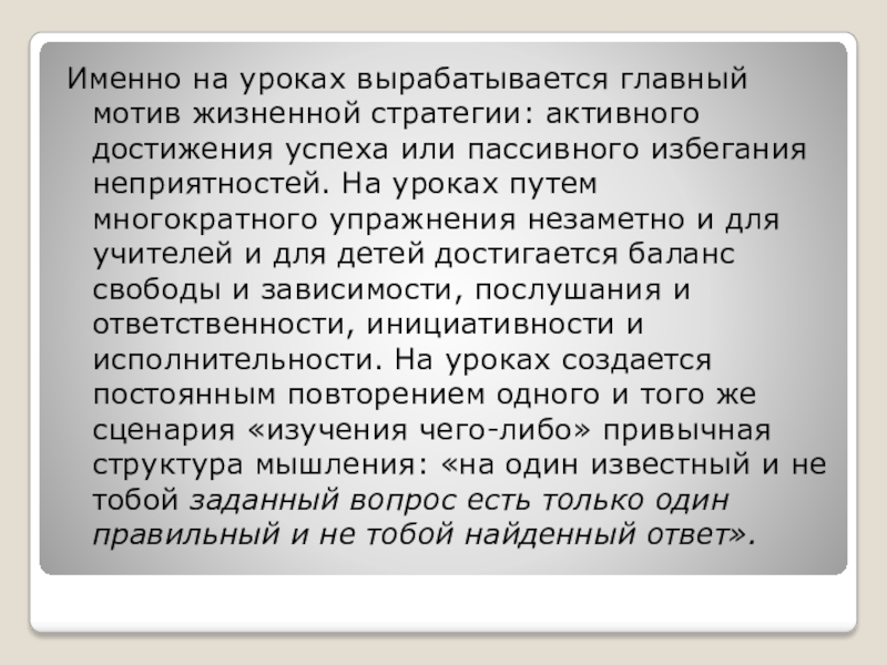 или пассивного избегания неприятностей. На уроках путем многократного упражнения незаметно и для учителей и для детей достигается баланс свободы и зависимости, послушания и ответственности, инициативности и исполнительности. На уроках создается постоянным повторением одного и того же сценария «изучения чего-либо» привычная структура мышления: «на один известный и не тобой заданный вопрос есть только один правильный и не тобой найденный ответ».