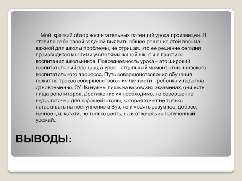 задачей выявить общее решение этой весьма важной для школы проблемы, не отрицая, что её решение сегодня производится многими учителями нашей школы в практике воспитания школьников. Повседневность урока – это широкий воспитательный процесс, а урок – отдельный момент этого широкого воспитательного процесса. Путь совершенствования обучения лежит на трассе совершенствования личности – ребёнка и педагога одновременно. ЗУНы нужны лишь на вузовских экзаменах, они есть пища репетиторов. Достижение их необходимо, но совершенно недостаточно для хорошей школы, которая хочет не только натаскивать на поступление в Вуз, но и «сеять разумное, доброе, вечное», и, кстати, не только сеять, но и отвечать за полученный урожай...
