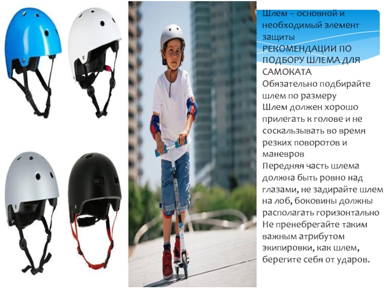 Шлем – основной и необходимый элемент защитыРЕКОМЕНДАЦИИ ПО ПОДБОРУ ШЛЕМА ДЛЯ САМОКАТАОбязательно подбирайте шлем по размеруШлем должен хорошо прилегать к голове и не соскальзывать во время резких поворотов и маневровПередняя часть шлема должна быть ровно над
