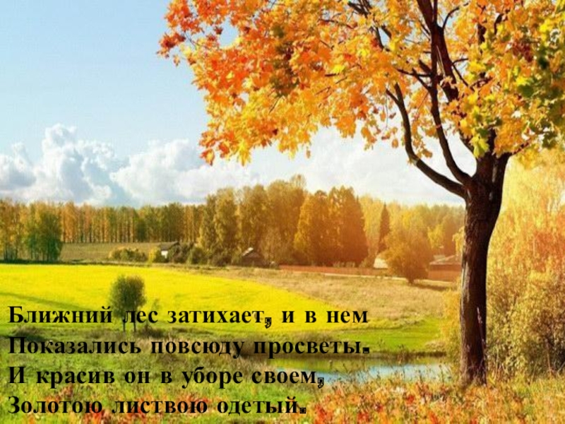 Ближний лес затихает, и в нем Показались повсюду просветы. И красив он в уборе своем, Золотою листвою