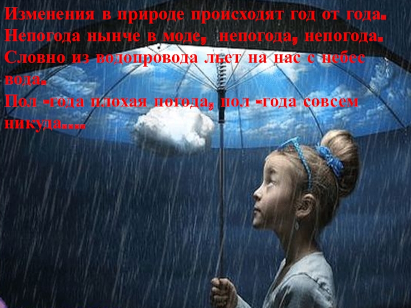 Изменения в природе происходят год от года.Непогода нынче в моде, непогода, непогода.Словно из водопровода льет на нас