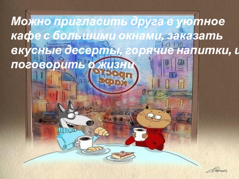Слайд 6 Можно пригласить друга в уютное кафе с большими окнами, заказать вкусные