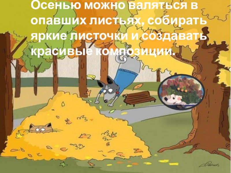 Слайд 4Осенью можно валяться в опавших листьях, собирать яркие листочки и создавать