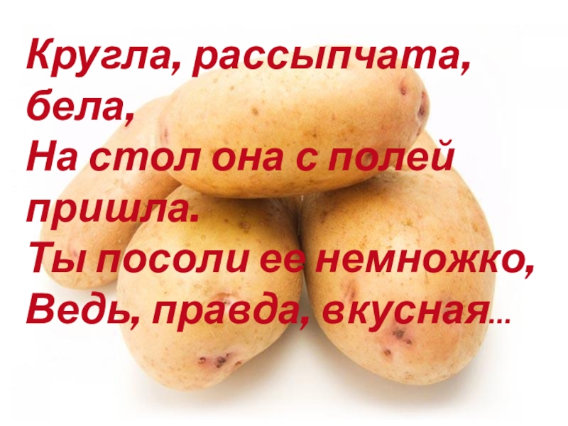 Кругла, рассыпчата, бела,  На стол она с полей пришла.  Ты посоли ее немножко,  Ведь, правда, вкусная…