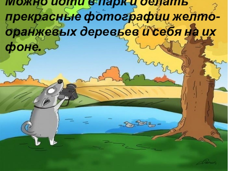 Слайд 7Можно идти в парк и делать прекрасные фотографии желто-оранжевых деревьев и