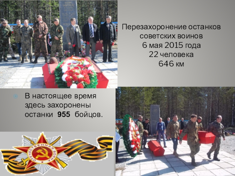Перезахоронение останков советских воинов  6 мая 2015 года 22 человека 646 км В настоящее время здесь