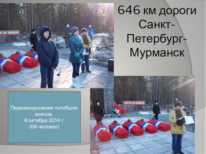 646 км дороги Санкт- Петербург- МурманскПерезахоронение погибших воинов.8 октября 2014 г.(68 человек)