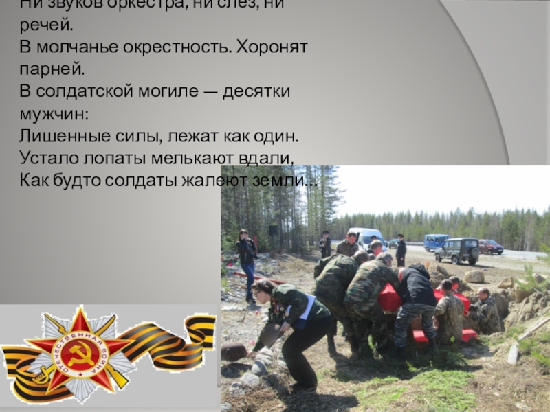 Слайд 11Ни звуков оркестра, ни слез, ни речей. В молчанье окрестность. Хоронят парней. В