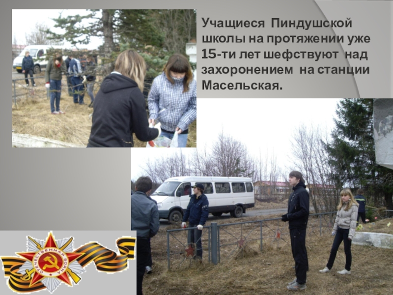 Слайд 12Учащиеся Пиндушской школы на протяжении уже 15-ти лет шефствуют над захоронением