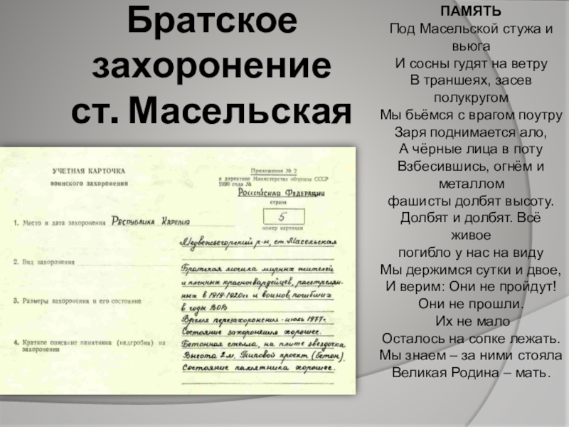 Презентация, доклад к проекту Братские захоронения Медвежьегорского района!
