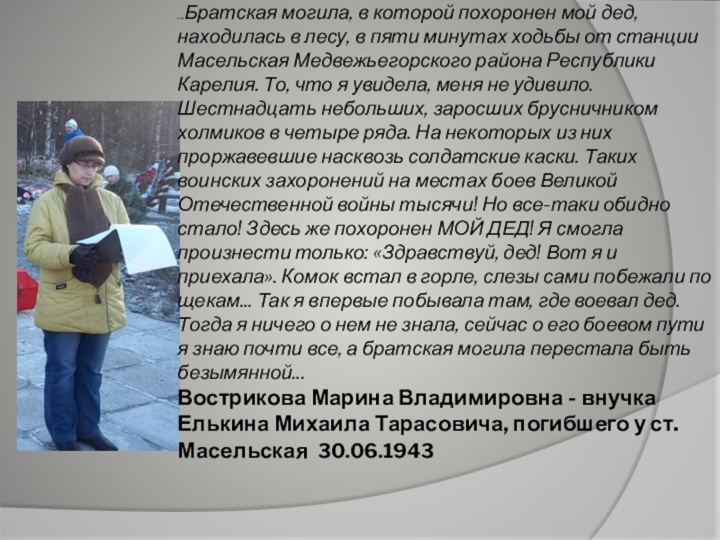 пяти минутах ходьбы от станции Масельская Медвежьегорского района Республики Карелия. То, что я увидела, меня не удивило. Шестнадцать небольших, заросших брусничником холмиков в четыре ряда. На некоторых из них проржавевшие насквозь солдатские каски. Таких воинских захоронений на местах боев Великой Отечественной войны тысячи! Но все-таки обидно стало! Здесь же похоронен МОЙ ДЕД! Я смогла произнести только: «Здравствуй, дед! Вот я и приехала». Комок встал в горле, слезы сами побежали по щекам... Так я впервые побывала там, где воевал дед. Тогда я ничего о нем не знала, сейчас о его боевом пути я знаю почти все, а братская могила перестала быть безымянной... Вострикова Марина Владимировна - внучка Елькина Михаила Тарасовича, погибшего у ст. Масельская 30.06.1943