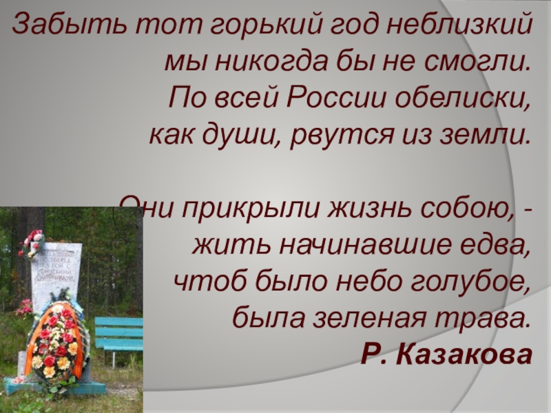 Забыть тот горький год неблизкий мы никогда бы не смогли. По всей России обелиски, как души, рвутся из земли. Они прикрыли жизнь собою, - жить начинавшие едва, чтоб было небо голубое, была зеленая трава.Р.
