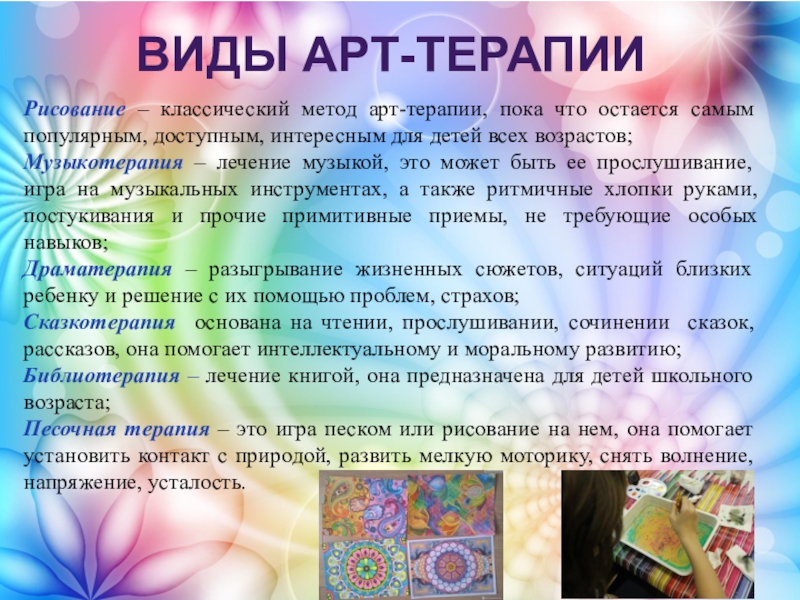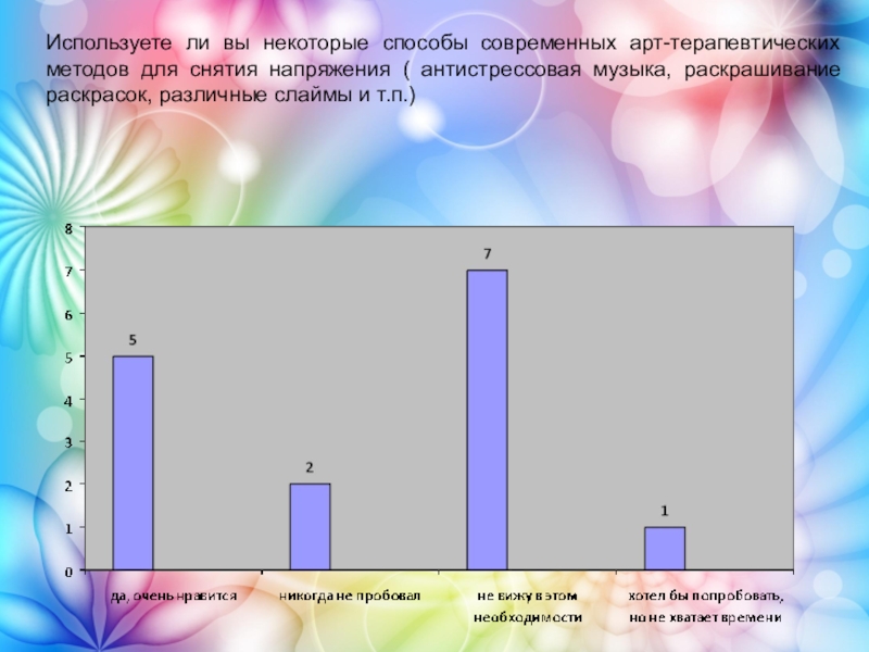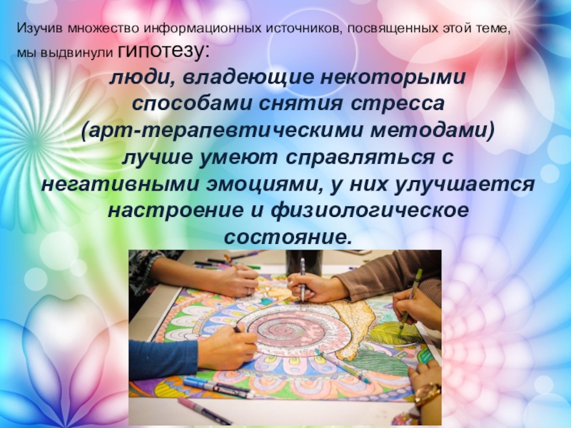 Мы решили подробнее остановиться на рисовании в технике «Эбру», раскрашивании антистрессовых раскрасок, мандал, прослушивании музыки для релаксации (китайская, японская), изготовлении и последующей релаксации с помощью так называемого «Лизуна» (слайма).