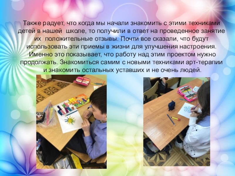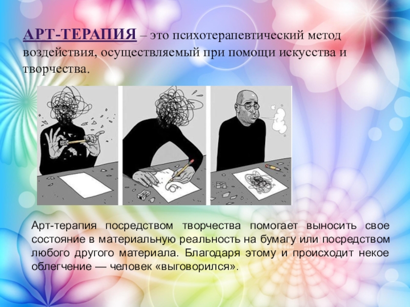 Арт-терапия посредством творчества помогает выносить свое состояние в материальную реальность на бумагу или посредством любого другого материала. Благодаря этому и происходит некое облегчение — человек «выговорился».
