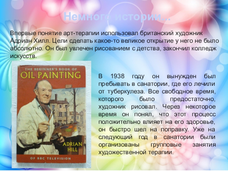 В 1938 году он вынужден был пребывать в санатории, где его лечили от туберкулеза. Все свободное время, которого было предостаточно, художник рисовал. Через некоторое время он понял, что этот процесс положительно влияет на его здоровье, он быстро шел на поправку. Уже на следующий год в санатории были организованы групповые занятия художественной терапии.