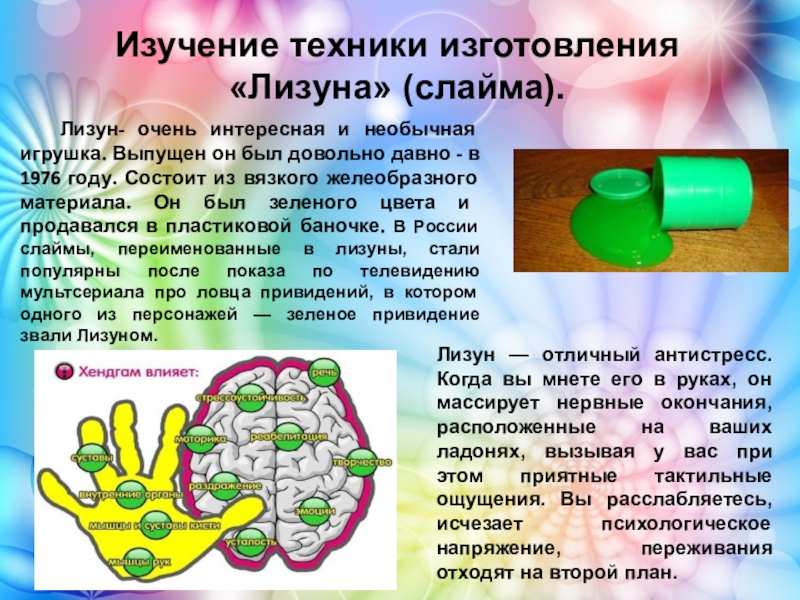Лизун — отличный антистресс. Когда вы мнете его в руках, он массирует нервные окончания, расположенные на ваших ладонях, вызывая у вас при этом приятные тактильные ощущения. Вы расслабляетесь, исчезает психологическое напряжение, переживания отходят на второй план.