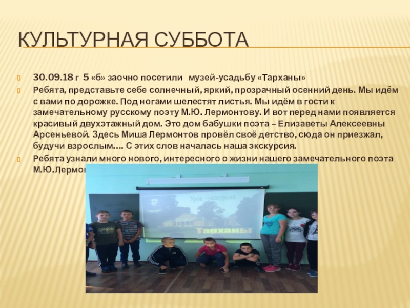 Культурная суббота30.09.18 г 5 «б» заочно посетили  музей-усадьбу «Тарханы»Ребята, представьте себе солнечный, яркий, прозрачный осенний день.