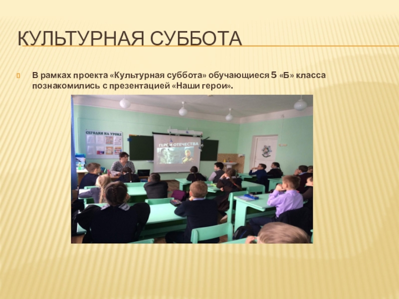 Культурная субботаВ рамках проекта «Культурная суббота» обучающиеся 5 «Б» класса познакомились с презентацией «Наши герои».