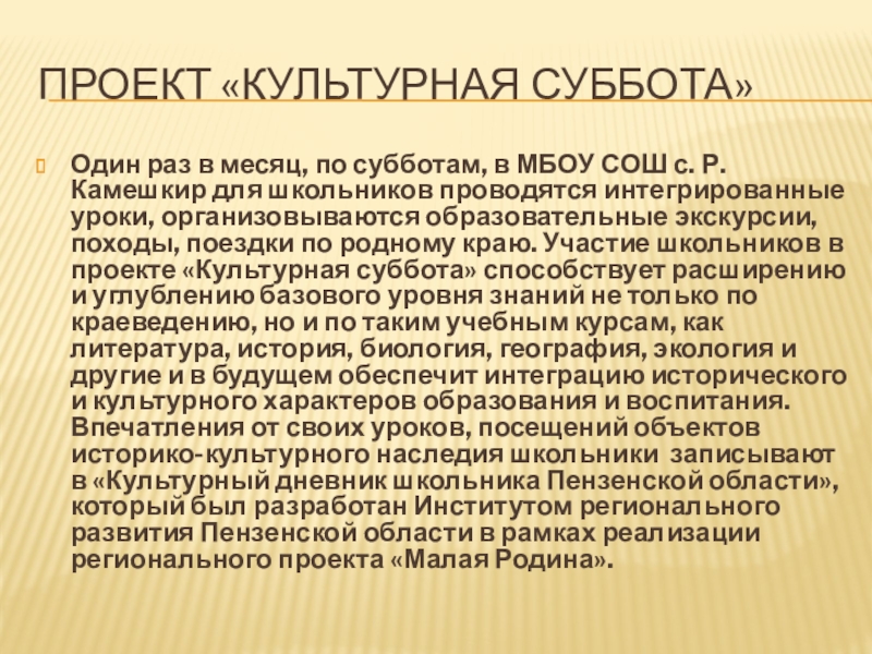 Проект «культурная суббота»Один раз в месяц, по субботам, в МБОУ СОШ с. Р.Камешкир для школьников проводятся интегрированные уроки, организовываются образовательные экскурсии, походы, поездки по родному краю. Участие школьников в проекте «Культурная суббота» способствует расширению и углублению