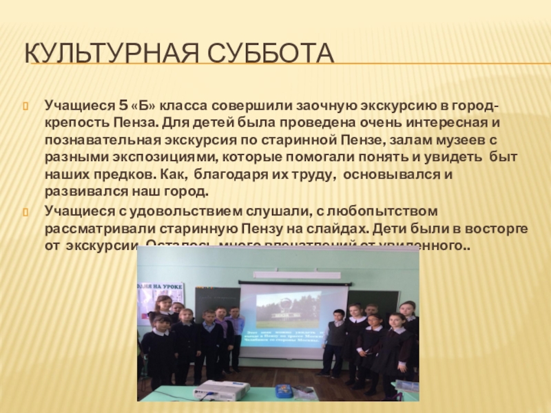 Культурная субботаУчащиеся 5 «Б» класса совершили заочную экскурсию в город-крепость Пенза. Для детей была проведена очень интересная