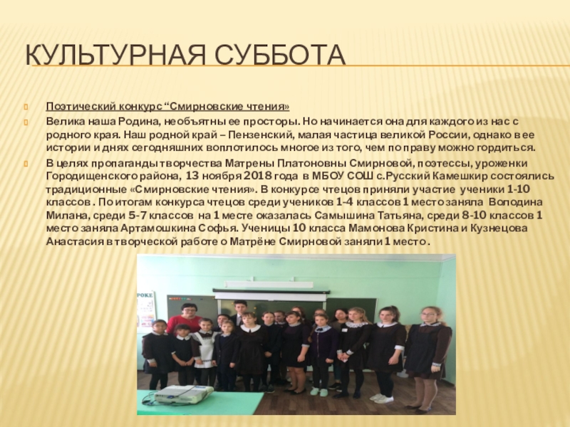 Культурная субботаПоэтический конкурс “Смирновские чтения»Велика наша Родина, необъятны ее просторы. Но начинается она для каждого из нас