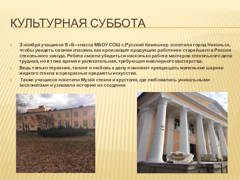 Культурная суббота3 ноября учащиеся 5 «Б» класса МБОУ СОШ с.Русский Камешкир посетили город Никольск, чтобы увидеть своими