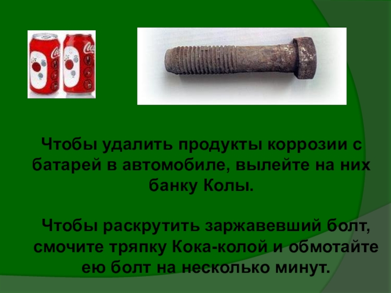Чтобы раскрутить заржавевший болт, смочите тряпку Кока-колой и обмотайте ею болт на несколько минут.