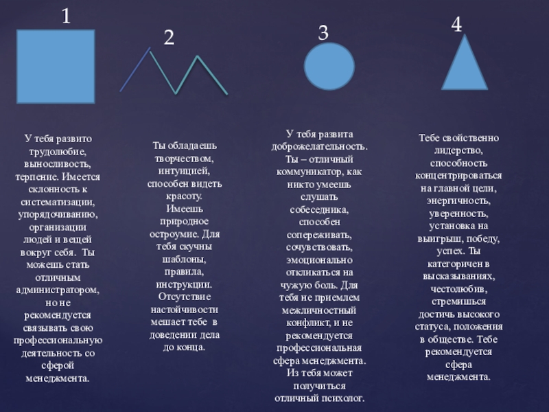 Ты обладаешь творчеством, интуицией, способен видеть красоту. Имеешь природное остроумие. Для тебя скучны шаблоны, правила, инструкции. Отсутствие настойчивости мешает тебе в доведении дела до конца.