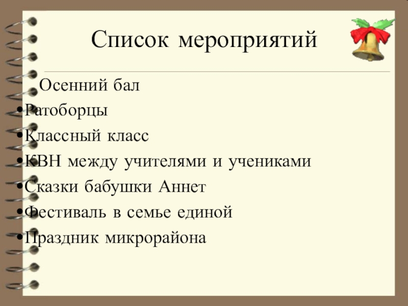 Список мероприятий  Осенний балРатоборцыКлассный классКВН между учителями и ученикамиСказки бабушки АннетФестиваль в семье единойПраздник микрорайона.