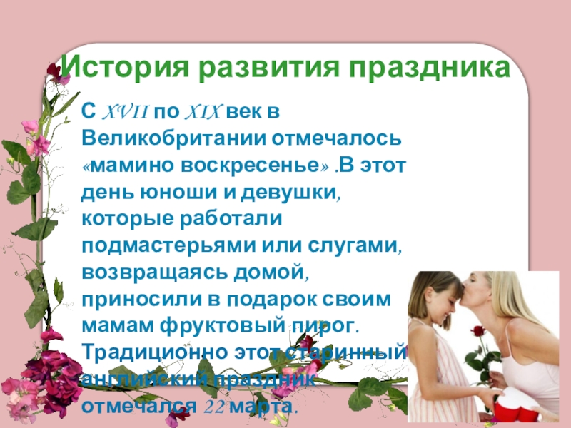 воскресенье» .В этот день юноши и девушки, которые работали подмастерьями или слугами, возвращаясь домой, приносили в подарок своим мамам фруктовый пирог. Традиционно этот старинный английский праздник отмечался 22 марта.