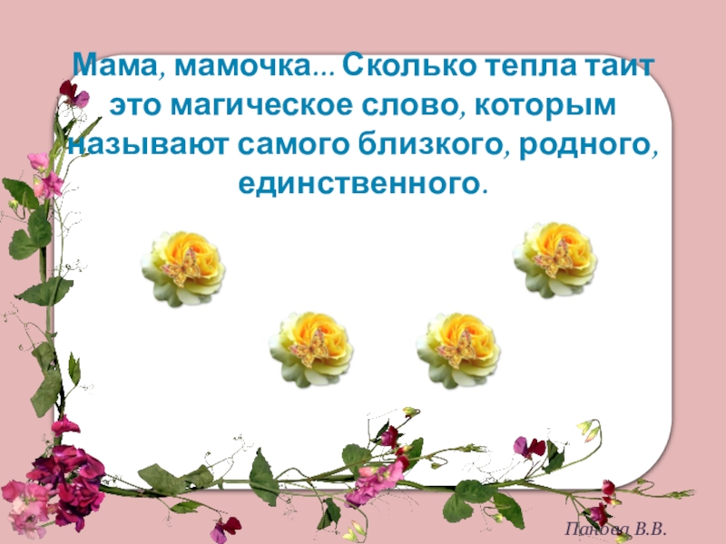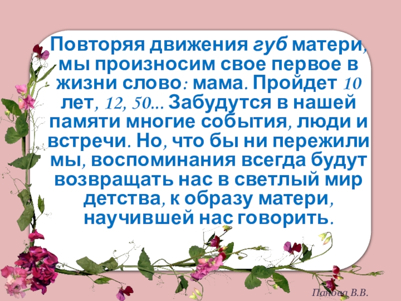 мама. Пройдет 10 лет, 12, 50... Забудутся в нашей памяти многие события, люди и встречи. Но, что бы ни пережили мы, воспоминания всегда будут возвращать нас в светлый мир детства, к образу матери, научившей нас говорить.