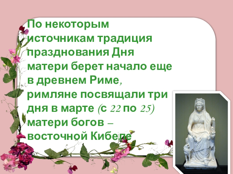 Слайд 3По некоторым источникам традиция празднования Дня матери берет начало еще в