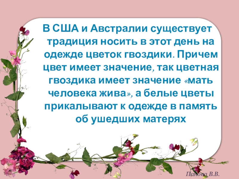 одежде цветок гвоздики. Причем цвет имеет значение, так цветная гвоздика имеет значение «мать человека жива», а белые цветы прикалывают к одежде в память об ушедших матерях