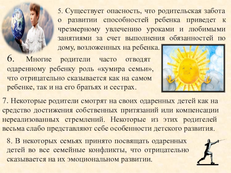 7. Некоторые родители смотрят на своих одаренных детей как на средство достижения собственных притязаний или компенсации нереализованных стремлений. Некоторые из этих родителей весьма слабо представляют себе особенности детского развития.