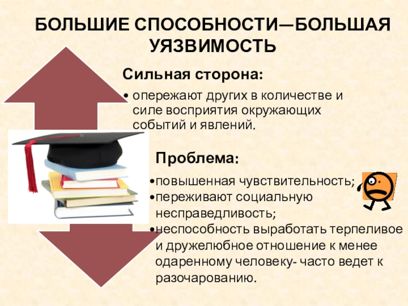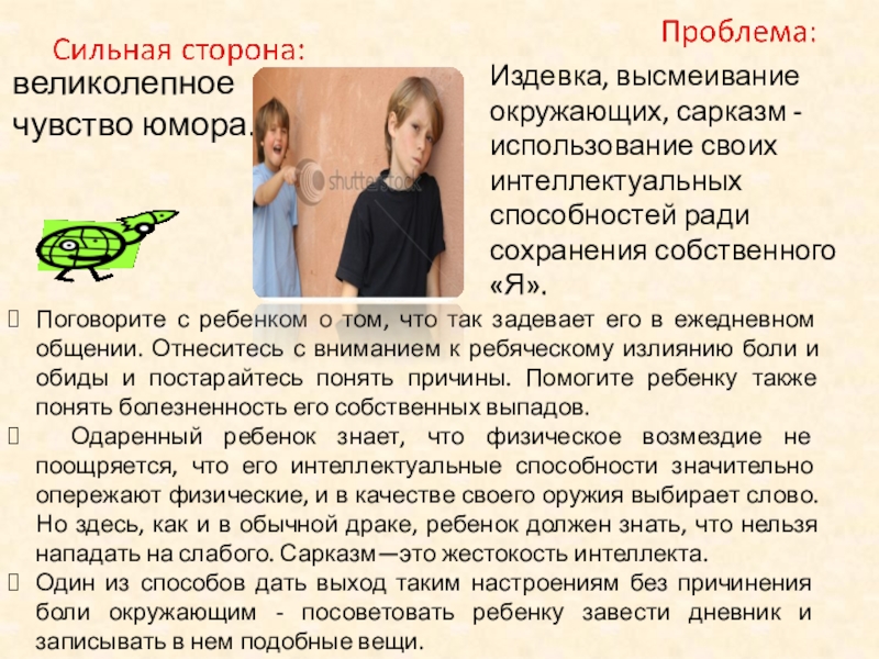 Одаренный ребенок знает, что физическое возмездие не поощряется, что его интеллектуальные способности значительно опережают физические, и в качестве своего оружия выбирает слово. Но здесь, как и в обычной драке, ребенок должен знать, что нельзя нападать на слабого. Сарказм—это жестокость интеллекта.