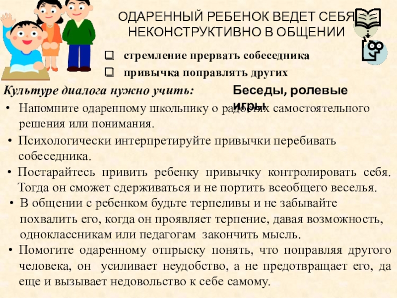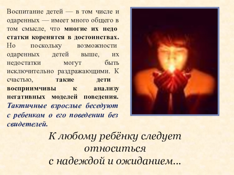 Воспитание детей — в том числе и одаренных — имеет много общего в том смысле, что многие их недостатки коренятся в достоинствах. Но поскольку возможности одаренных детей выше, их недостатки могут быть исключительно раздражающими. К счастью, такие дети восприимчивы к анализу негативных моделей поведения. Тактичные взрослые беседуют с ребенком о его поведении без свидетелей.