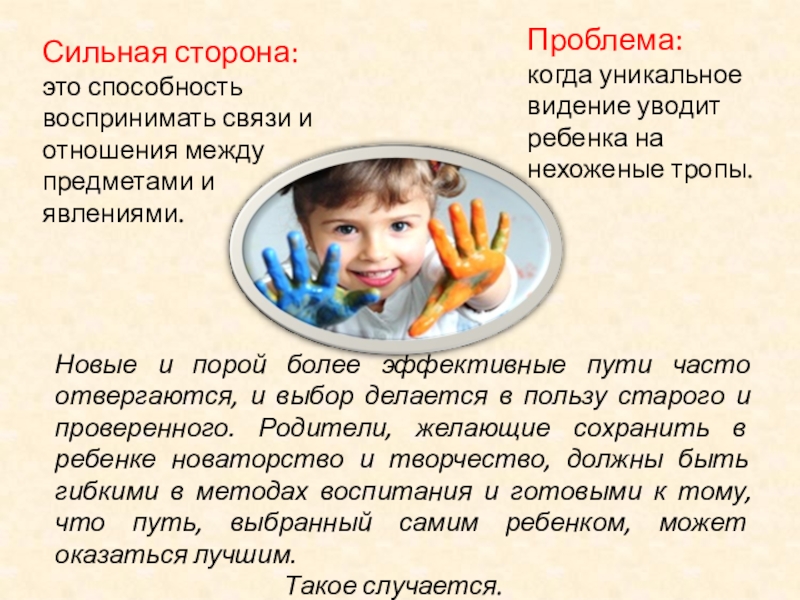 Новые и порой более эффективные пути часто отвергаются, и выбор делается в пользу старого и проверенного. Родители, желающие сохранить в ребенке новаторство и творчество, должны быть гибкими в методах воспитания и готовыми к тому, что путь, выбранный самим ребенком, может оказаться лучшим.