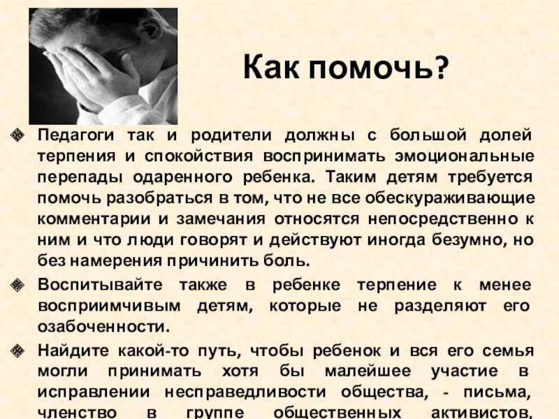 2. Родители часто ожидают от своих детей слишком многого. Например, они склонны считать, что социальные способности одаренного ребенка могут быть такими же высокими, как и умственные.