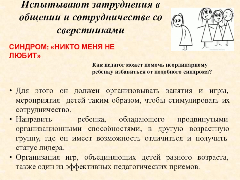 Направить ребенка, обладающего продвинутыми организационными способностями, в другую возрастную группу, где он имеет возможность отличиться и получить статус лидера.