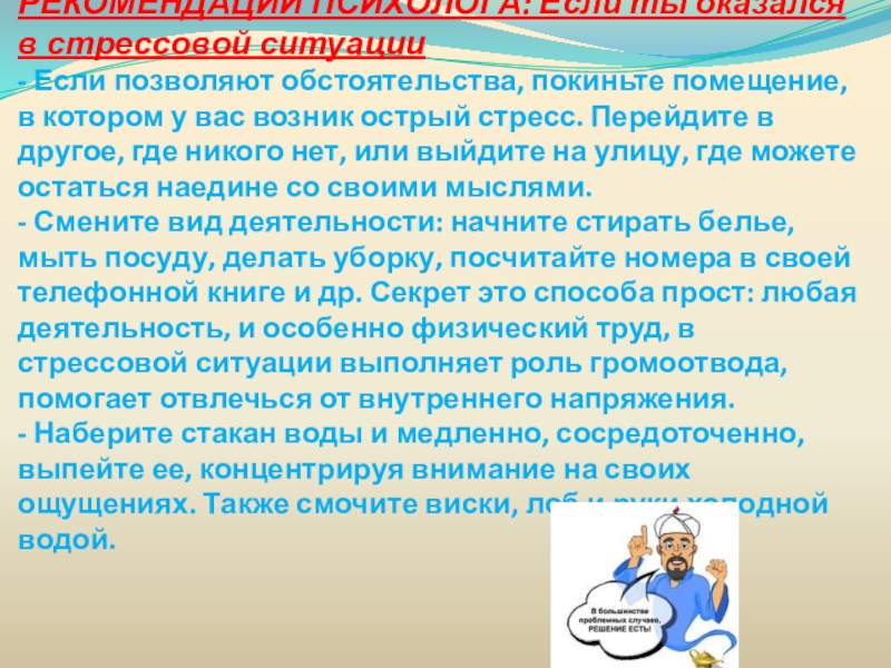 Слайд 9РЕКОМЕНДАЦИИ ПСИХОЛОГА: Если ты оказался в стрессовой ситуации