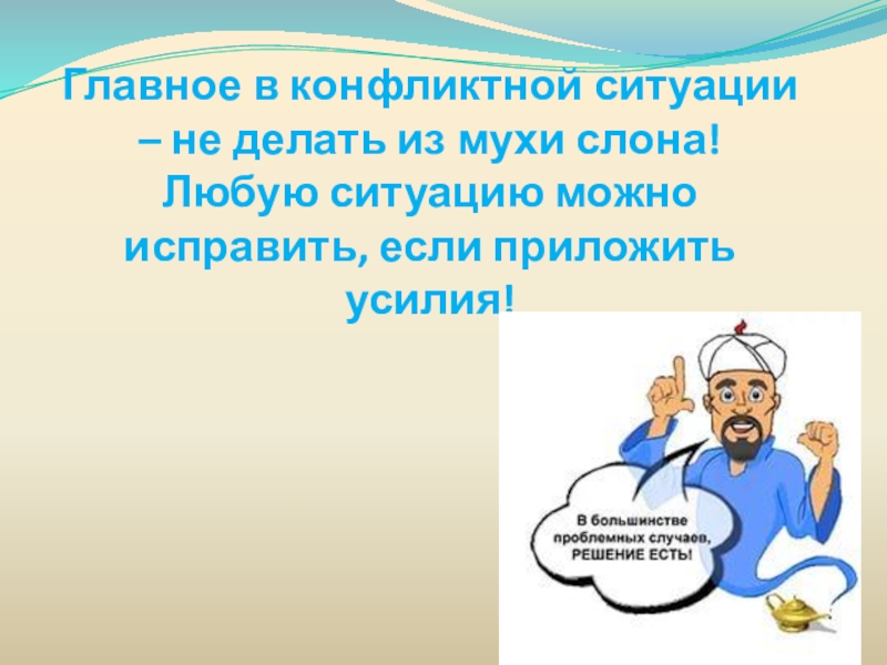 Слайд 5Главное в конфликтной ситуации – не делать из мухи слона!